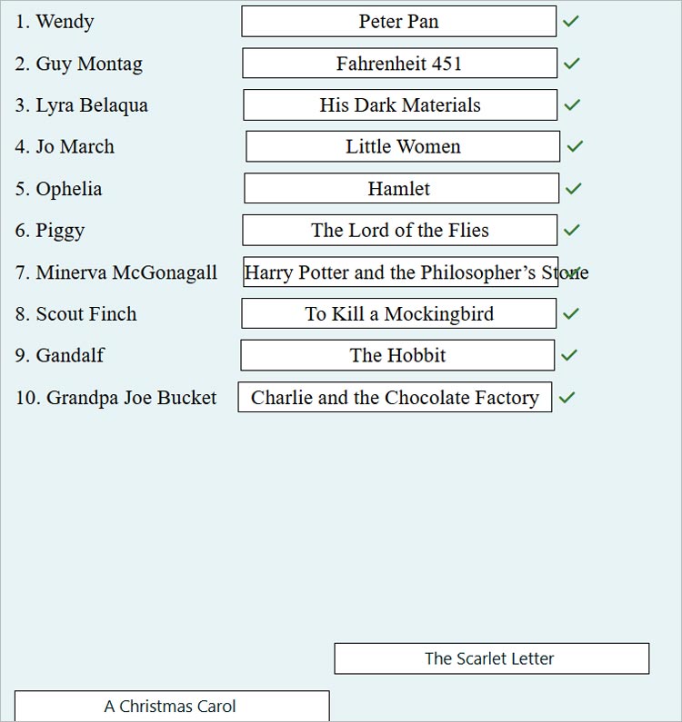 Также приводим одно из интересных заданий на сопоставление главных героев книг и названий произведений английской литературы: