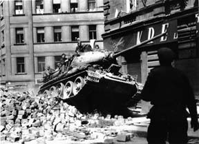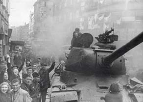 Танк Т-34-85 преодолевает баррикаду на улице одного из чешских городов |