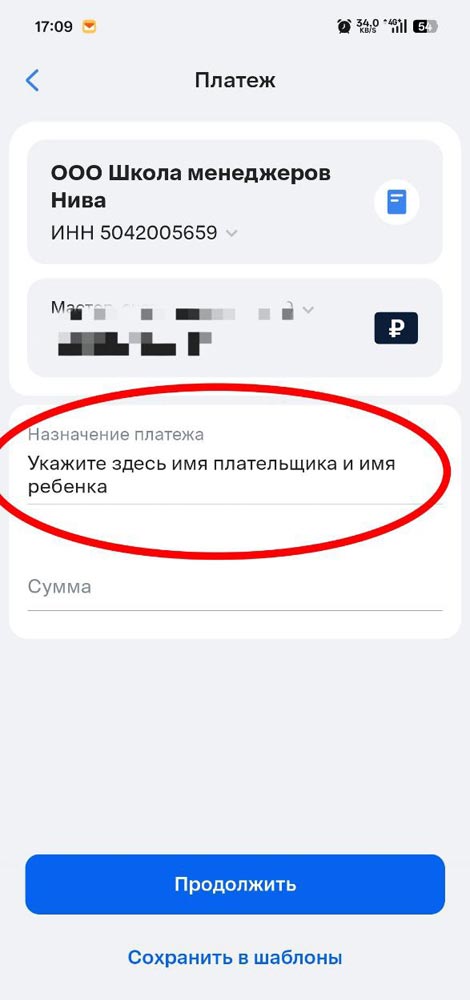 Назначение платежа: Указать имя плательщика и имя ребенка